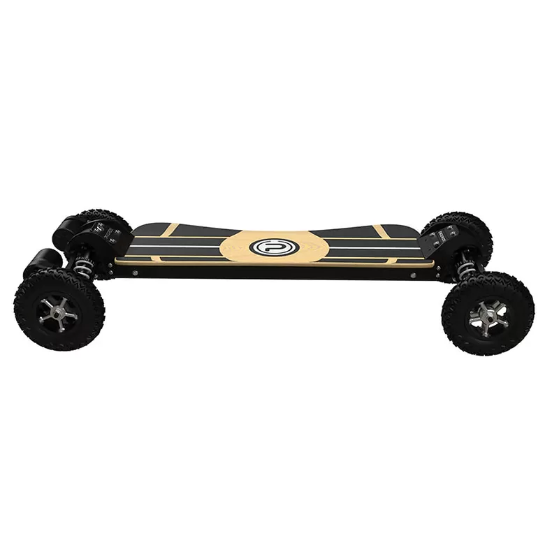 ✓ Wheels & Portability As an added layer of shock absorption, this off-road electric skateboard comes with 8 inch pneumatic wheels with knobby treads that offer great grip and traction while riding. When it comes to portability, the Endeavor S eboard weighs a hefty 17 kg which is no surprise considering its components. It can be dragged to roll on one side or simply carried with the help of the inlay handles underneath the deck.