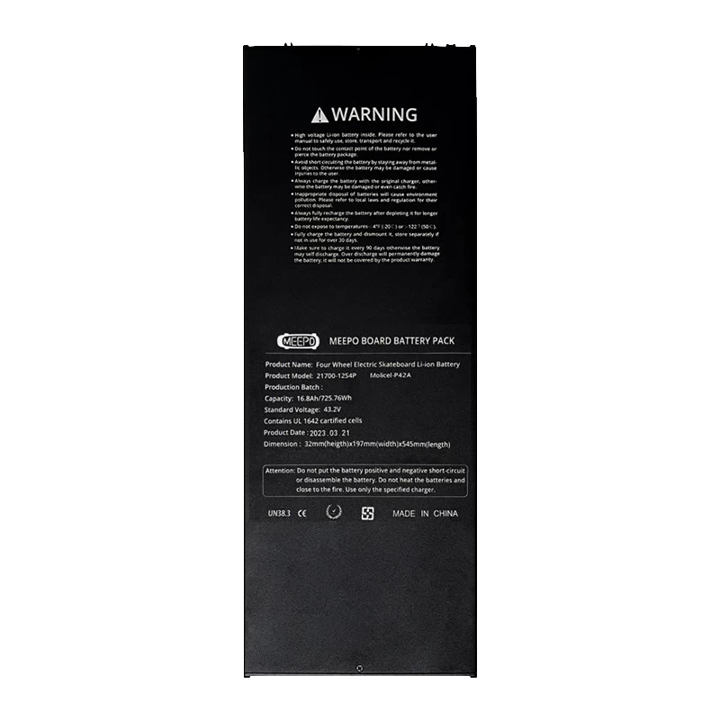 This battery from Meepo consists of the Molicel P42A 21700 cells in a 12S4P configuration. This gives it a capacity of 16.8 Ah / 725.8 Wh, and a nominal voltage of 43.2V.