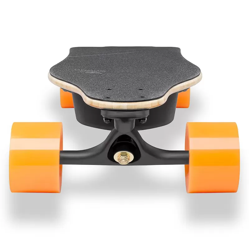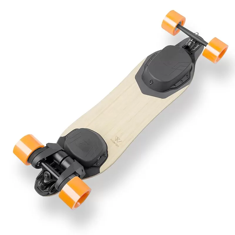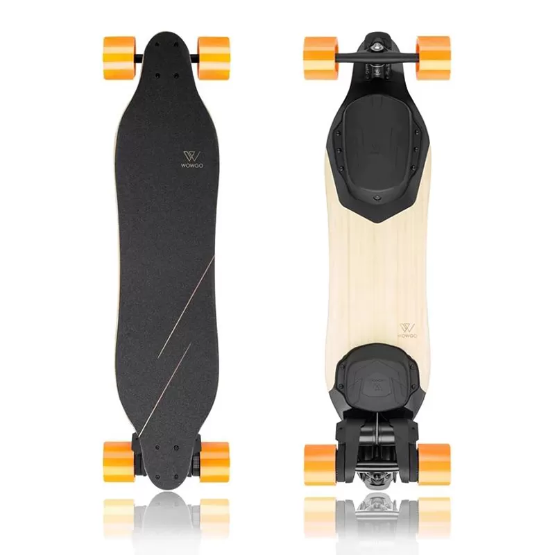 ✓ High-quality build and design The well-proven deck is made using a combination of bamboo and fiberglass, which makes the whole longboard extremely flexy, yet strong. The enclosures for ESC and battery are made from highly durable plastic to reduce weight. They are also smaller, compared to previous generations for a more aesthetic look. We offer this electric longboard in 2 different color options. If you like a more natural look, the WowGo 3 Orange with its bamboo finish is the right fit. But if you prefer a more modern look and the combination of black and orange, WowGo 3 Black is perfect for you.