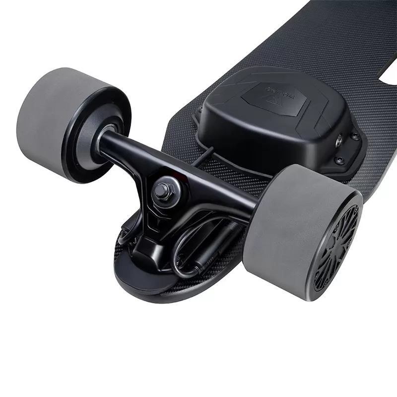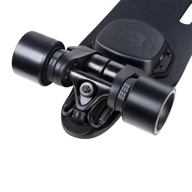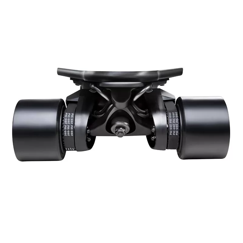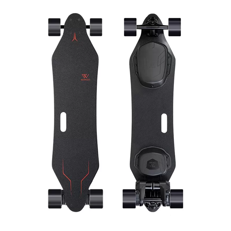 ✓ Switchable drive trains The WowGo Knight electric skateboard can easily switch between the HUB and belt drive trains. Both systems are similar in power, with the HUB motors having a combined power output of 1100 W and the belt motors having a combined output of 1200 W. Each motor system has its pros and cons, each having a wide following. HUB motors are easier to maintain,quieter, and more efficient. Belt drive trains provide better torque,offer exchangeable wheels and provide a more comfortable ride. The Knight is also compatible with a number of other electric board motors on the market. This option to easily switch drivetrains is an exceptional feature that is not available in most high-end competitor models.