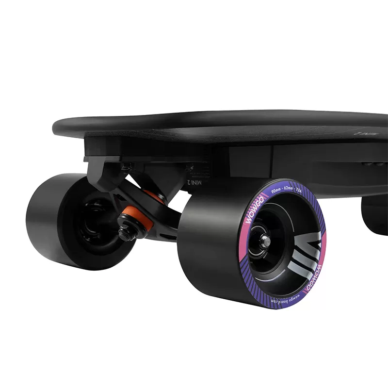 ✓ WowGo Trucks & High Risers WowGo uses its proprietary 45-degree trucks for the Mini 2, allowing for a smooth and responsive riding experience that makes the electric skateboard feel nimble without sacrificing stability. The risers are slightly higher than most eboards to prevent a phenomenon known as wheel bite, where the wheels touch the deck during sharp turns. To adjust how hard the eboard turns, the bushings can be tightened or loosened to suit preference.